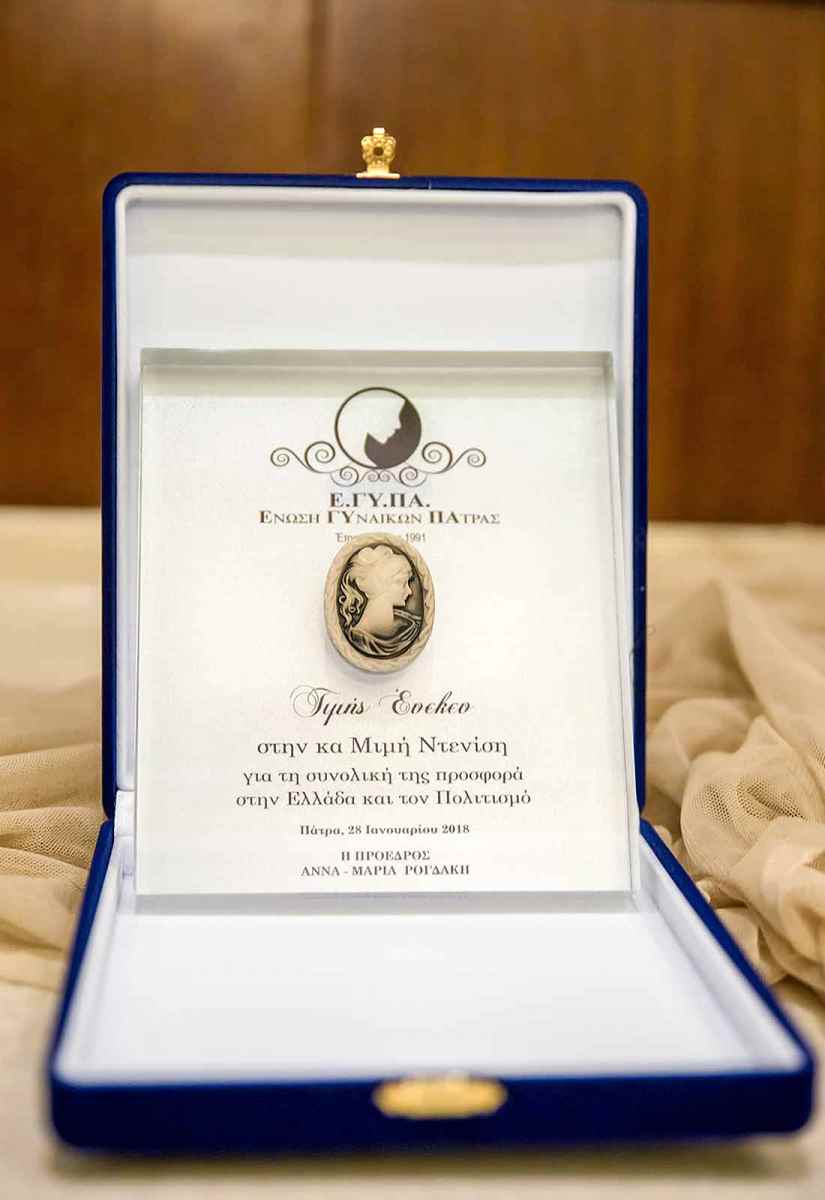 Σε μια υπέροχη τελετή η Ένωση Γυναικών Πάτρας, το μεγαλύτερο Φιλανθρωπικό Σωματείο στην Νοτιοδυτική Ελλάδα με 28ετή συνεχόμενη μεγάλη προσφορά σε Νοσοκομεία, Ιδρύματα και φορείς της περιοχής, τίμησε για την προσφορά της στην Ελλάδα και τον Πολιτισμό την κα Μιμή Ντενίση.